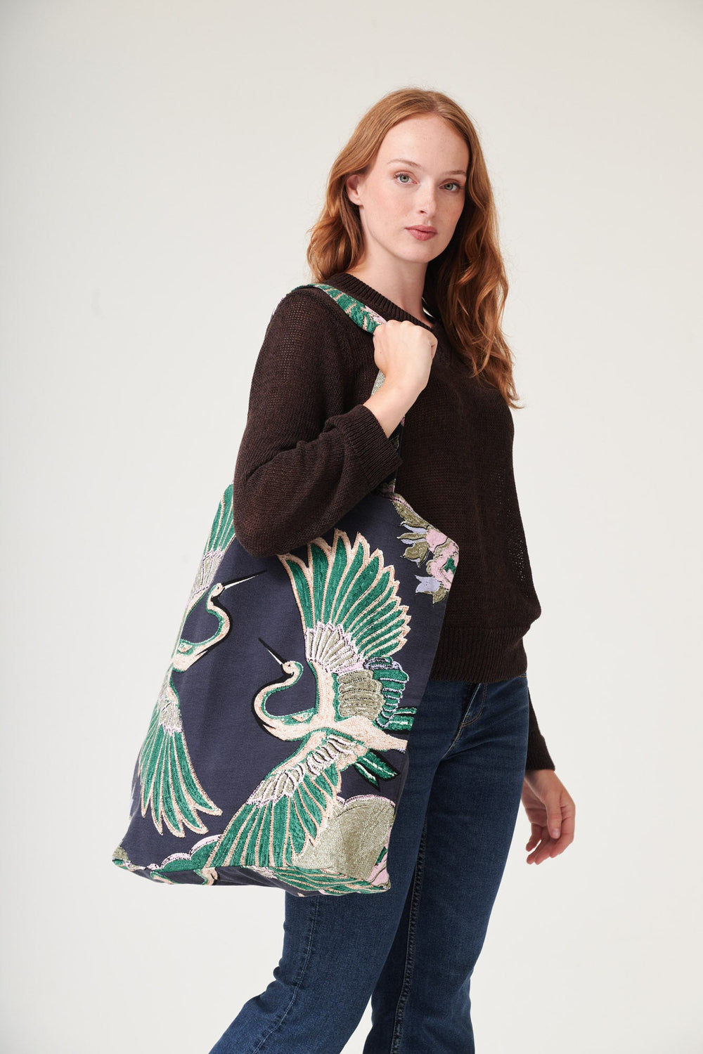These large, graceful cranes in sand, pink and emerald, green fly across this ‘nearly black’ base.