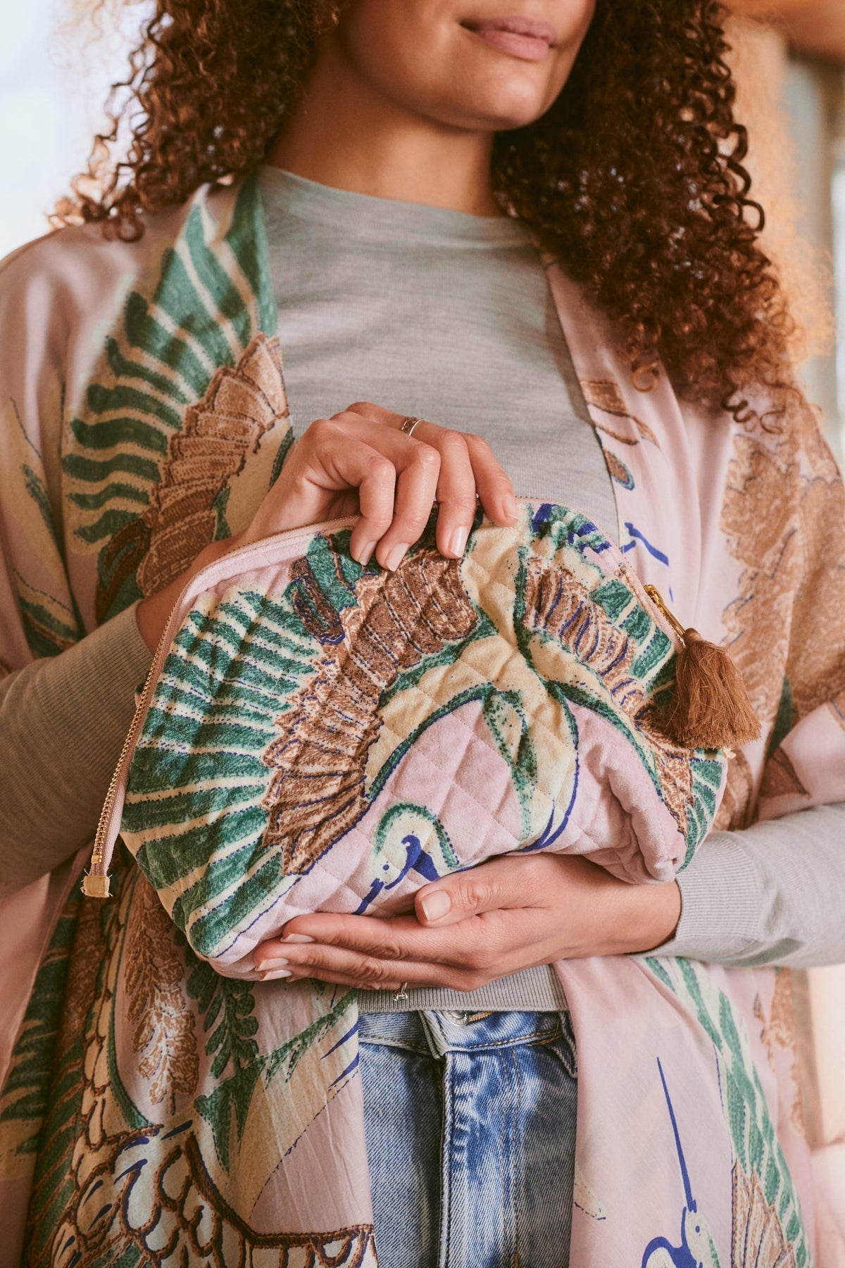 This 100% organic cotton velvet pouch is perfect for throwing in your handbag, taking on a trip away, and even for elevating your look as a clutch bag. With a large main compartment and two pockets in the lining, this velvet pouch has enough room to store all the products you'd need for any event.