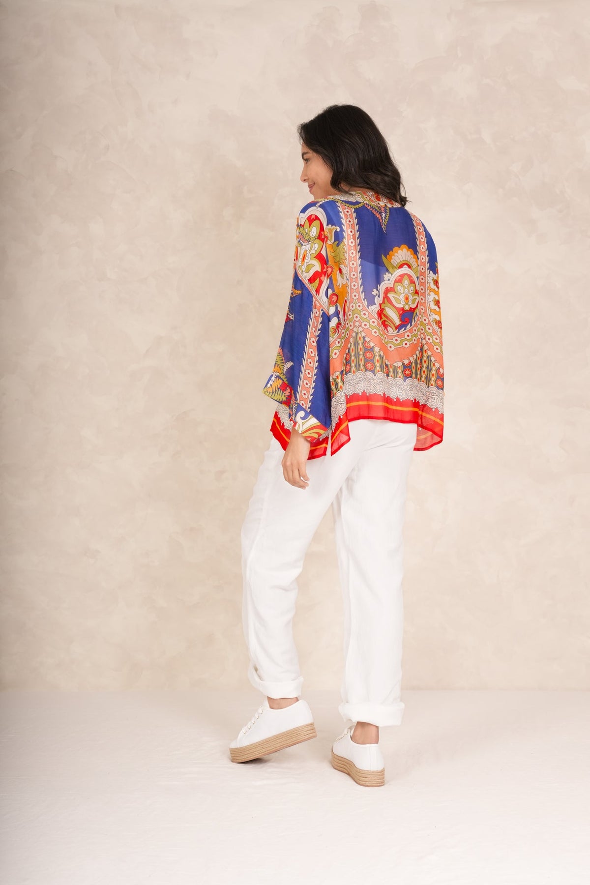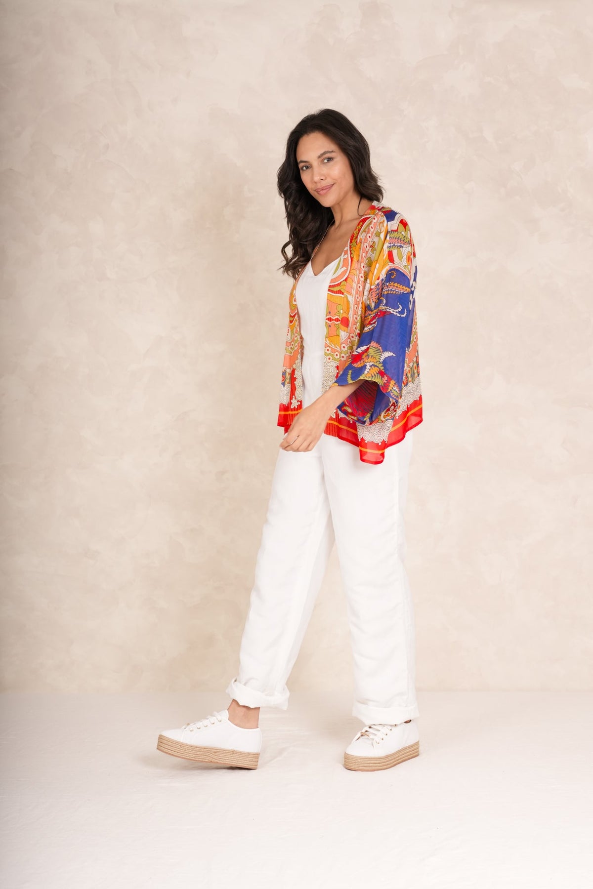 Our bestselling kimono jackets have loose ¾ length sleeves, an open front and a lightly embroidered lapel. Pair with a matching camisole and your favourite jeans in summer or layer over a polo neck during the cooler months.