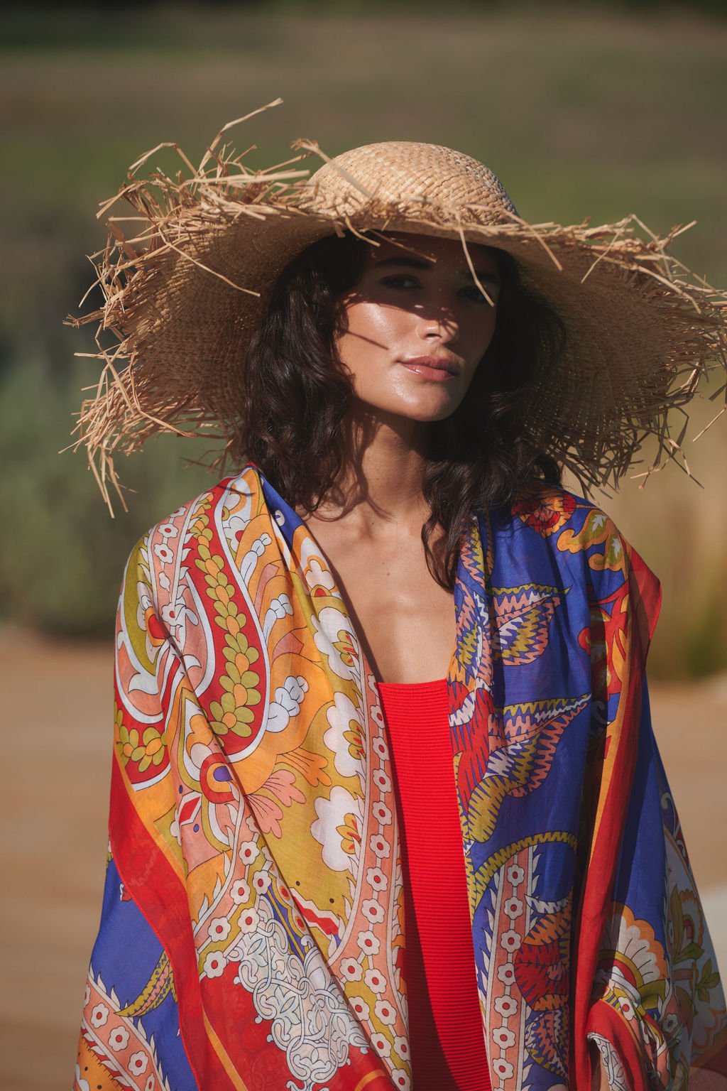 Bold and strong, this new, exciting print is inspired by the Rio carnival. Hot high season colours of cobalt and scarlet stand out against softer oranges, perfect for high summer holidays or evening parties.