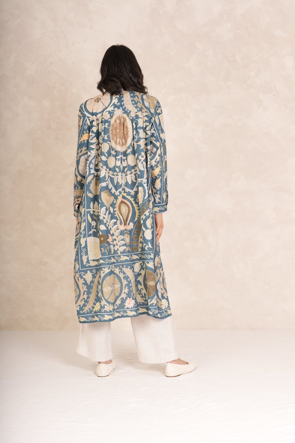 A bold oversized pattern inspired by traditional Suzani needlework throws originating from East Asia made by embroidering a chain stitch pattern to a cloth base.