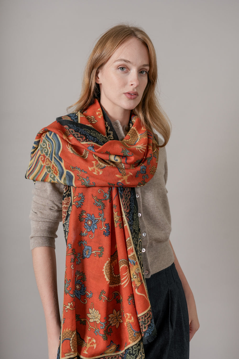 The Chinese dragon, or Lóng, has inspired this print. We have used deep, rich complementary colours to give a fresh look to the vintage pattern. Heavy background colours with gold dragons moving over the print and finished with a geometric border. In Chinese culture, dragons are seen as a symbol of good luck, prosperity, and power. We hope wearing our beautiful dragon pieces gives you all three!