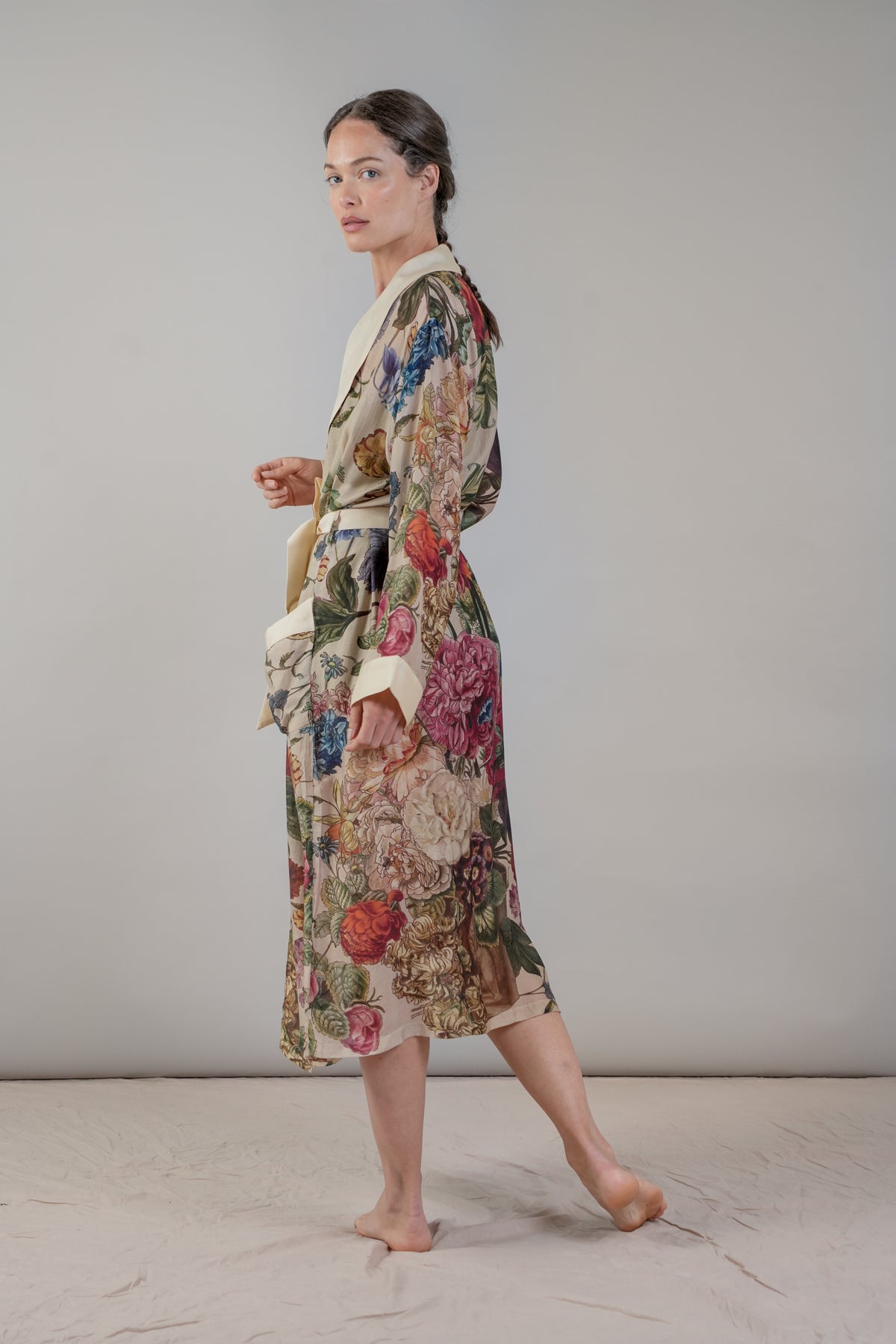 This Gown is made from a custom blend of modal and cupro which creates a silky smooth lightweight material while having a more sustainable impact on the environment. This lightweight design falls to an elegant long length and features a fold over collar, complete with self-tie waist belt and front patch pockets. This gown is perfect as a luxurious house coat or for layering as a chic accessory to your favourite outfit.