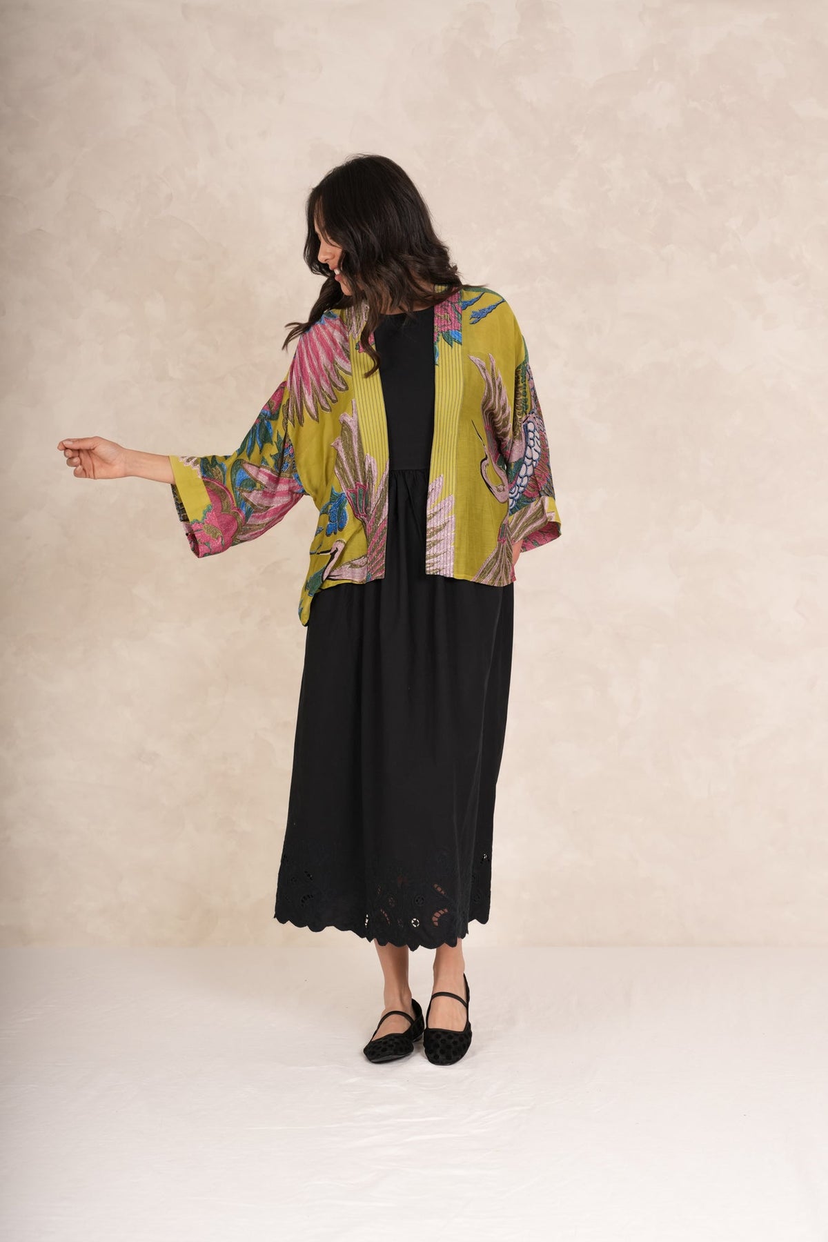 Our bestselling kimono jackets have loose ¾ length sleeves, an open front and a lightly embroidered lapel. Pair with a matching camisole and your favourite jeans in summer or layer over a polo neck during the cooler months.