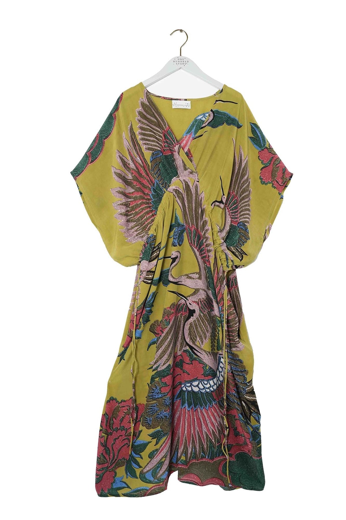 The crane symbolises good fortune in many cultures, and this vibrant print is undoubtedly something to celebrate! Featuring a bold background adorned with elegant birds in clever colour combinations. The green, blue, and pink on the crane set off against the rich olive background will make the wearer smile.