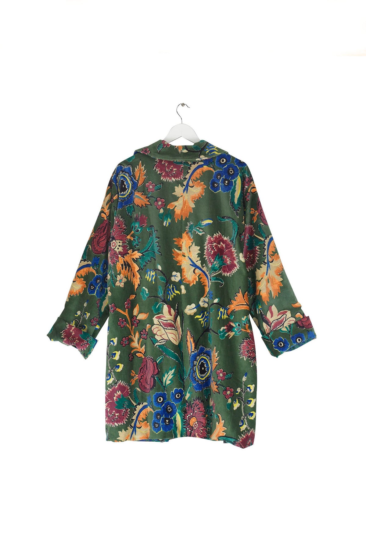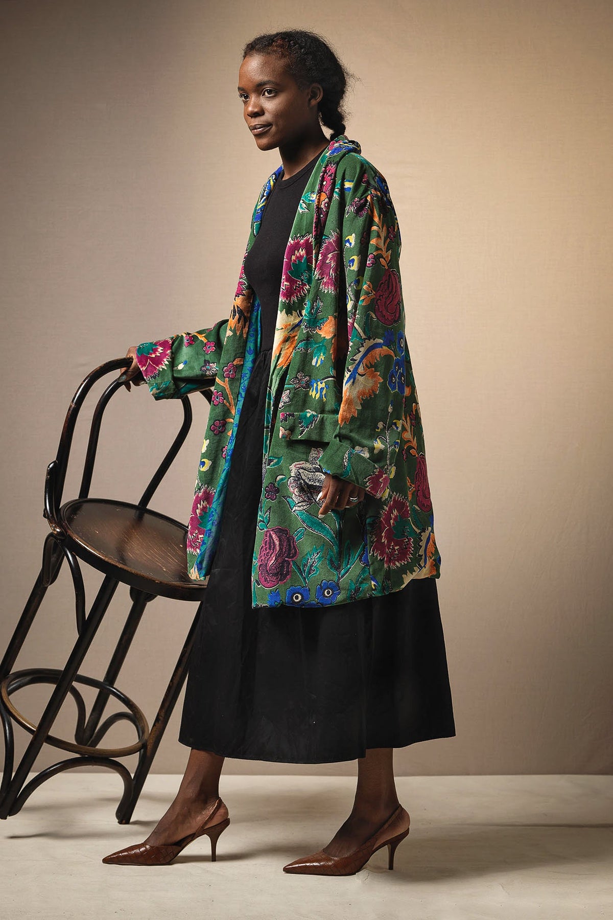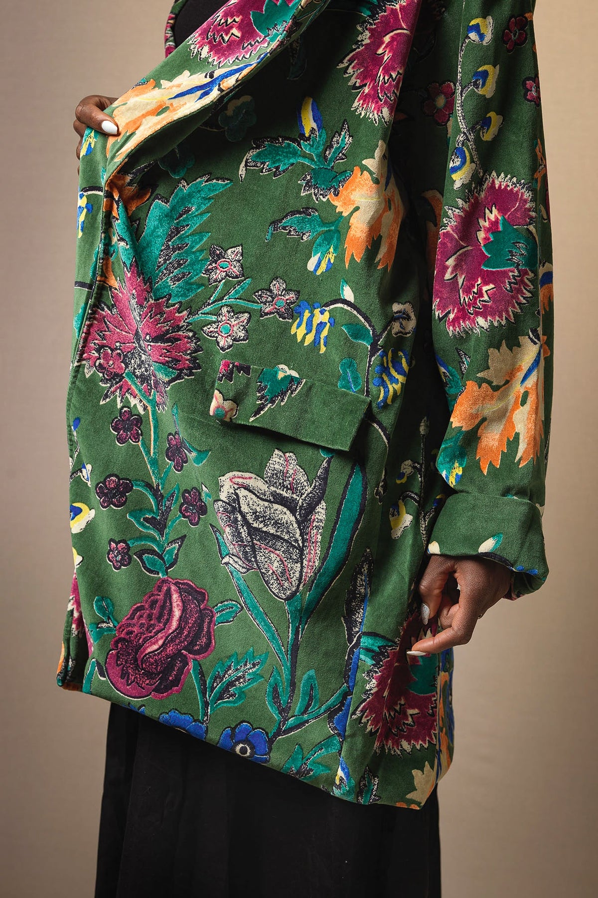 Brand new this season our luxury velvet boyfriend jackets are a relaxed three-quarter length blazer style jacket with turn-up sleeves and a shawl lapel. The interior is lined in a beautiful contrasting block print. There are two welt pockets with flaps which are also lined in velvet and contrasting block print. The sleeves are long ad designed to be turned up to create a large velvet cuff or if you prefer you could add another turn and flash the vibrant lining.