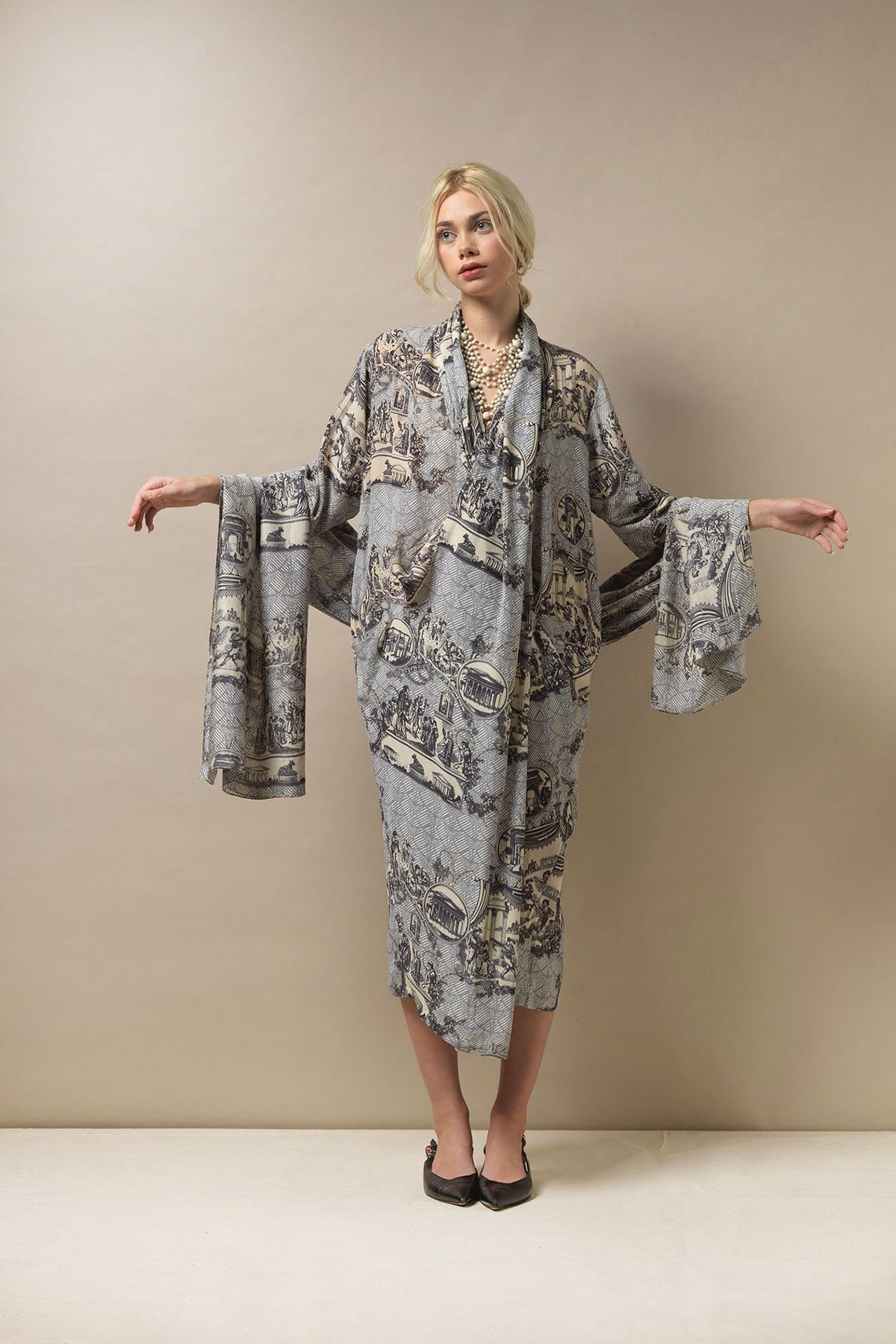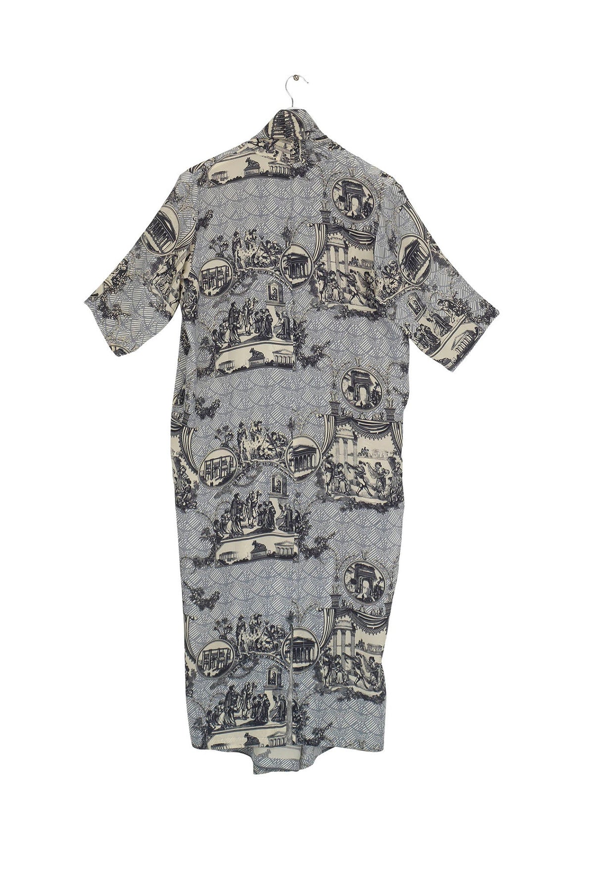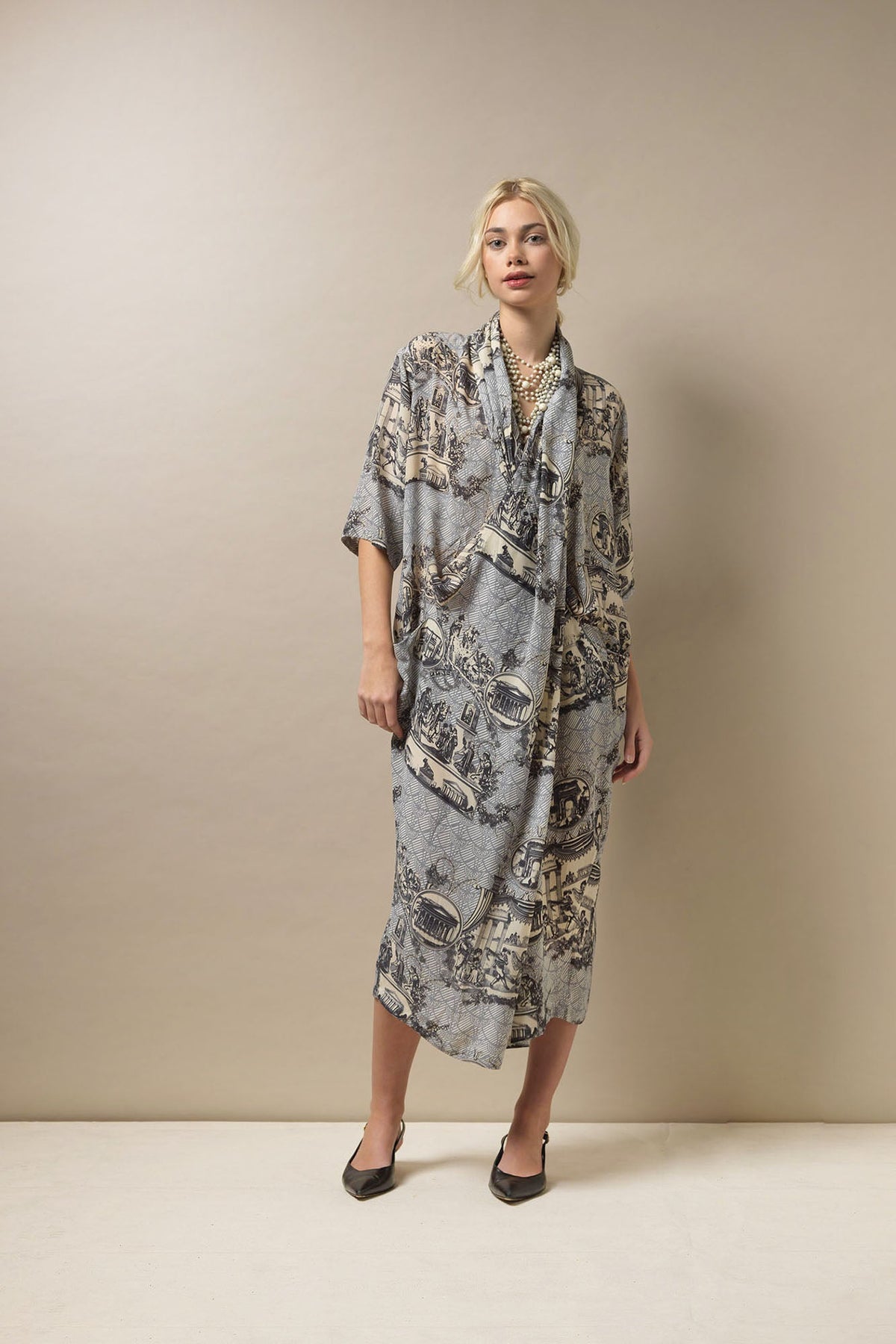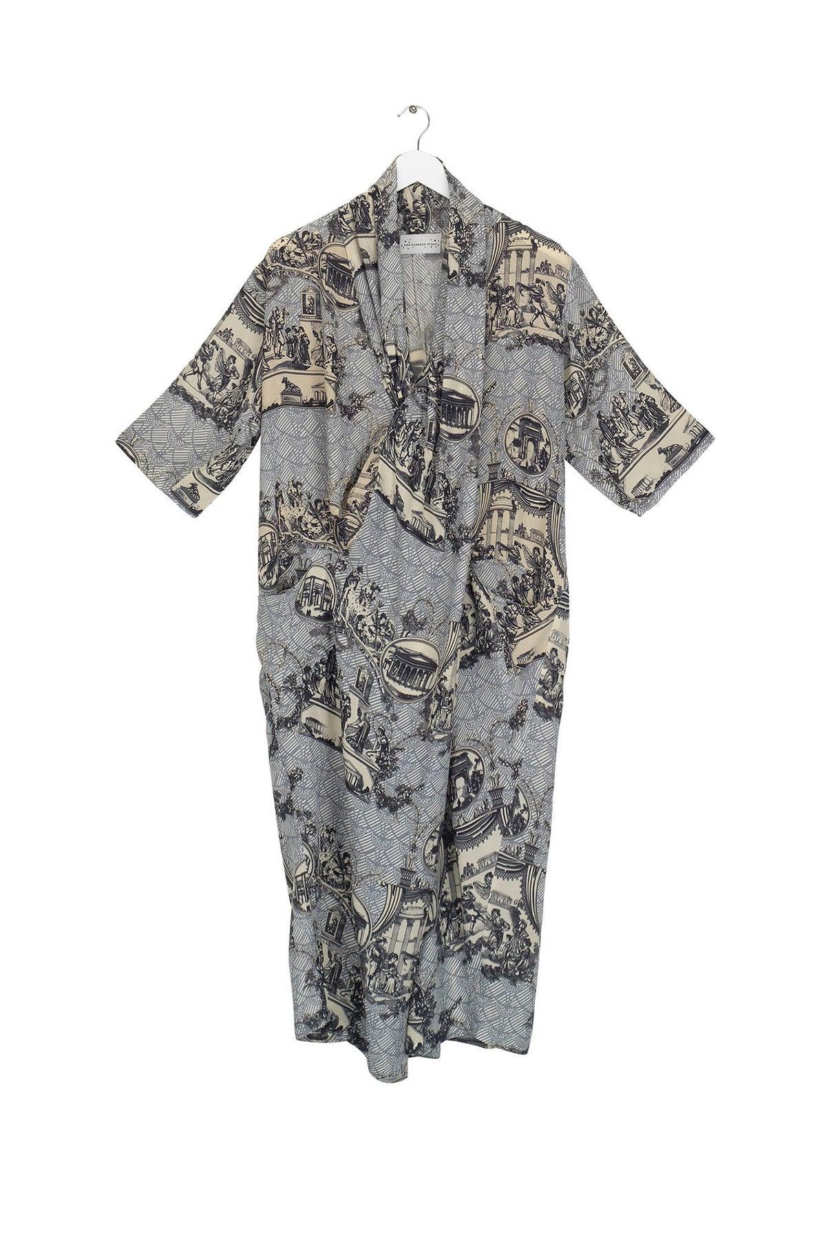 The Ancient Columns Charcoal print is inspired by classic vintage French Toile De Jouy fabrics but with a twist. It features delicate sketches and detailed scenes of ancient Roman and Greek architecture. This new monochrome colourway features deep charcoal greys making it eminently wearable any time of year!