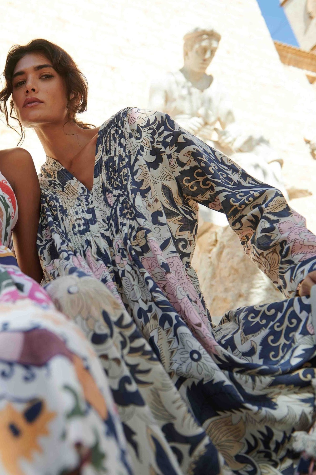 With its delicately pleated placket top leading down to a flowing maxi skirt, this dress showcases the entire One Hundred Stars signature print.