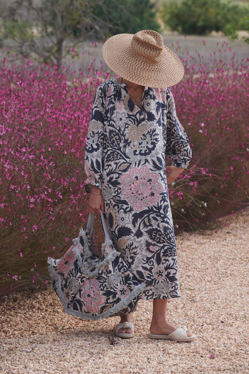 Made with a linen mix fabric, this dress features a flattering placket neckline, a raglan sleeve, hidden side pockets and a half elasticated cuff and perfectly displays our bespoke prints.