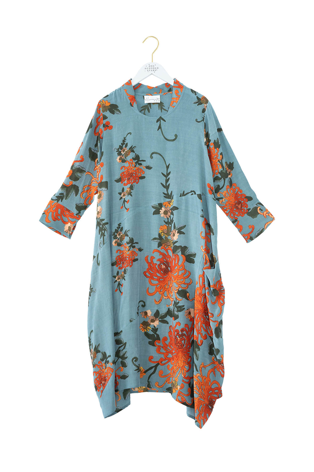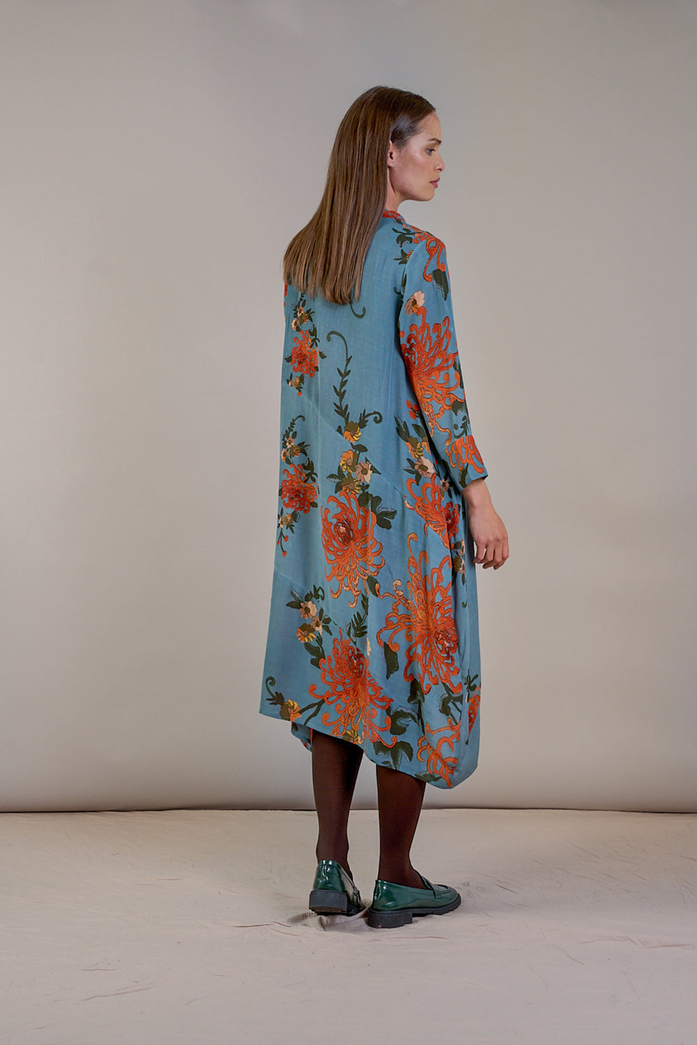 This 3/4 length dress is cut to hang asymmetrically, has a delicately detailed collar and two handy pockets, one on the front and another hidden within the side seam.