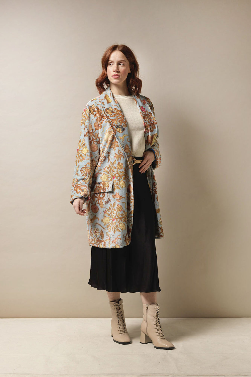 Tudor Rose is a fun print based on collections of antique Tudor rose embroidery and Jacobean crewelwork. You will find stylised florals, discretely placed insects and leaping hares among just some of the delightful motifs which adorn this garment!