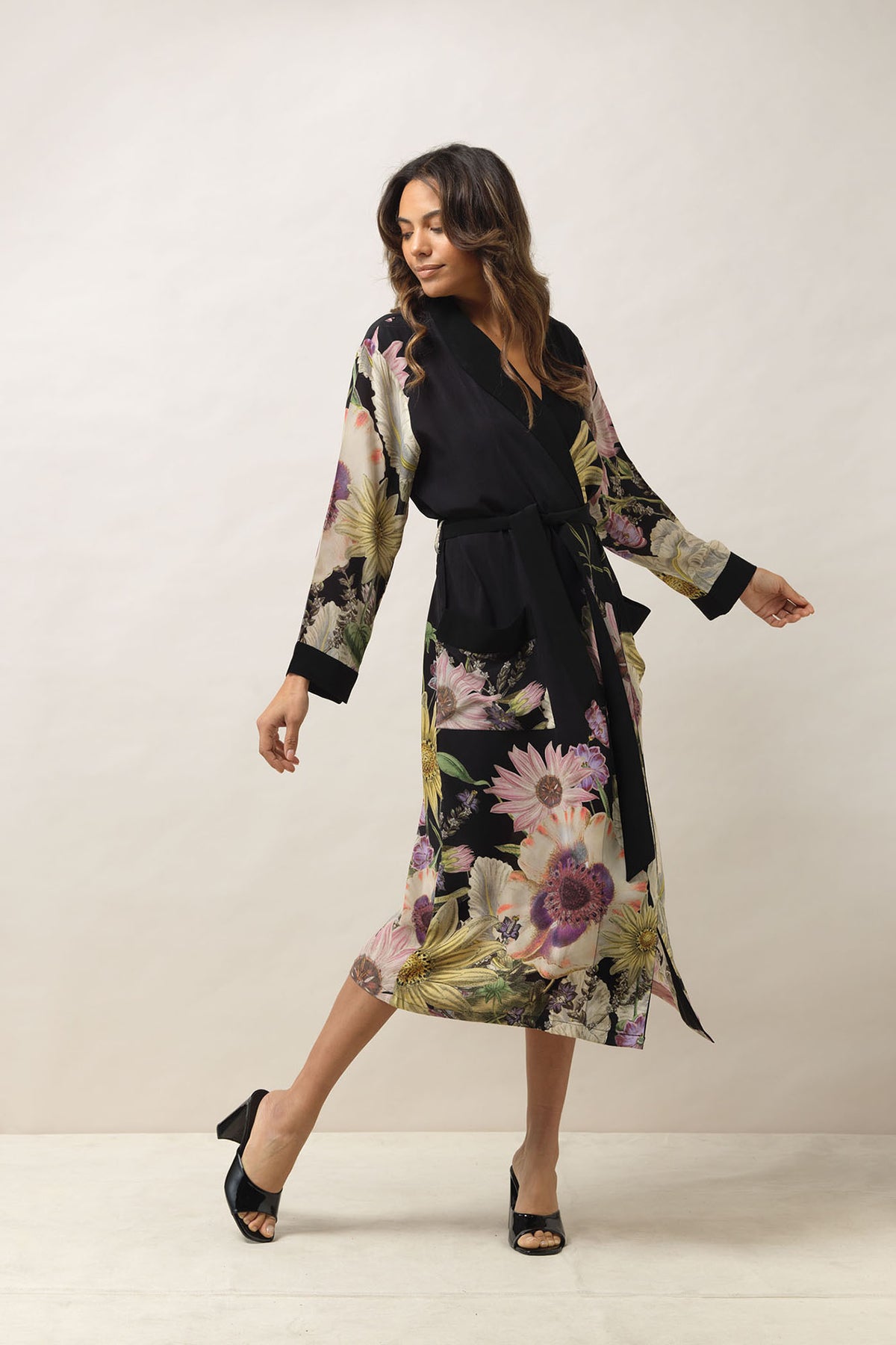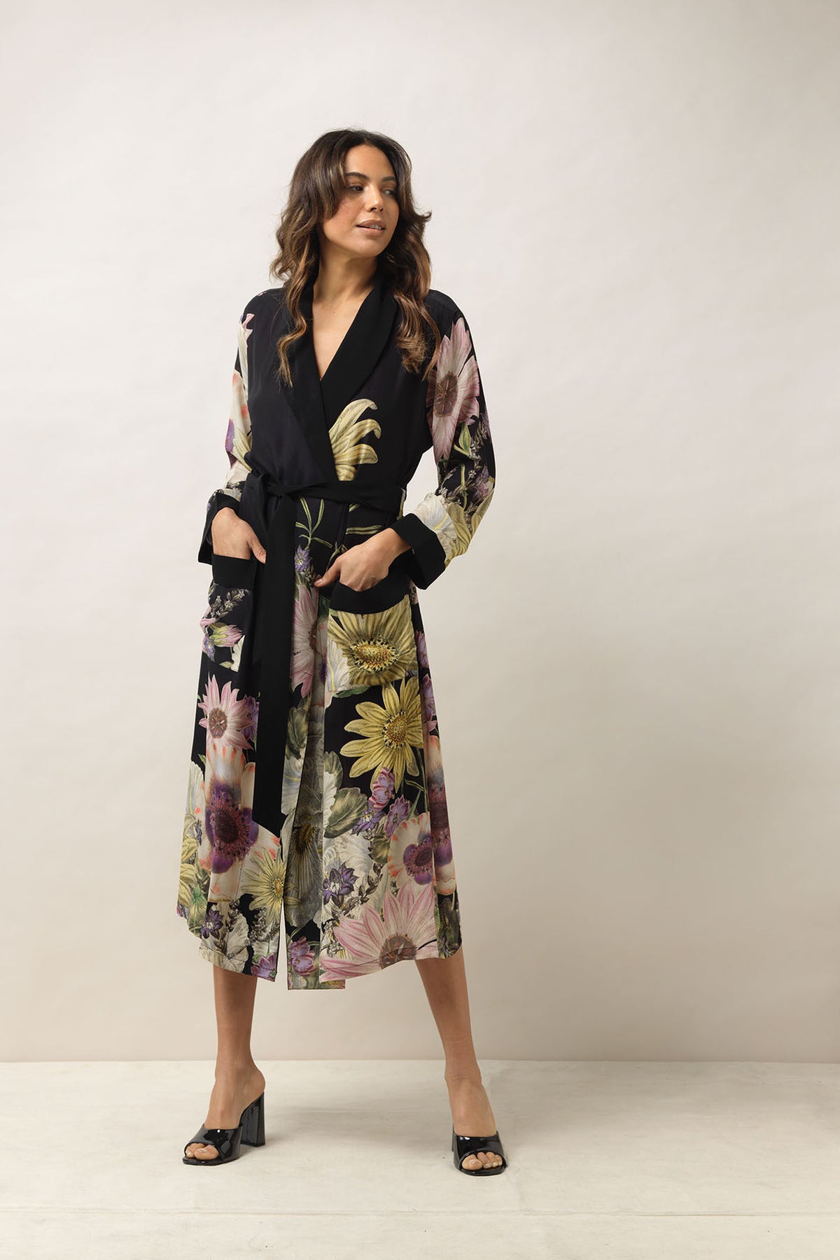 This design falls to an elegant long length and features a fold over collar, complete with self-tie waist belt and front patch pockets. This gown is perfect as a luxurious house coat or for layering as a chic accessory to your favourite outfit.