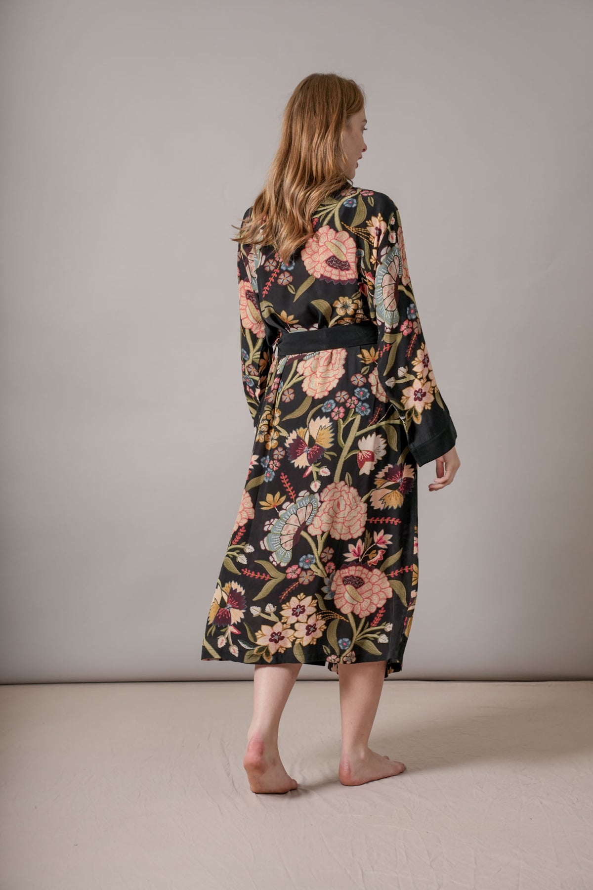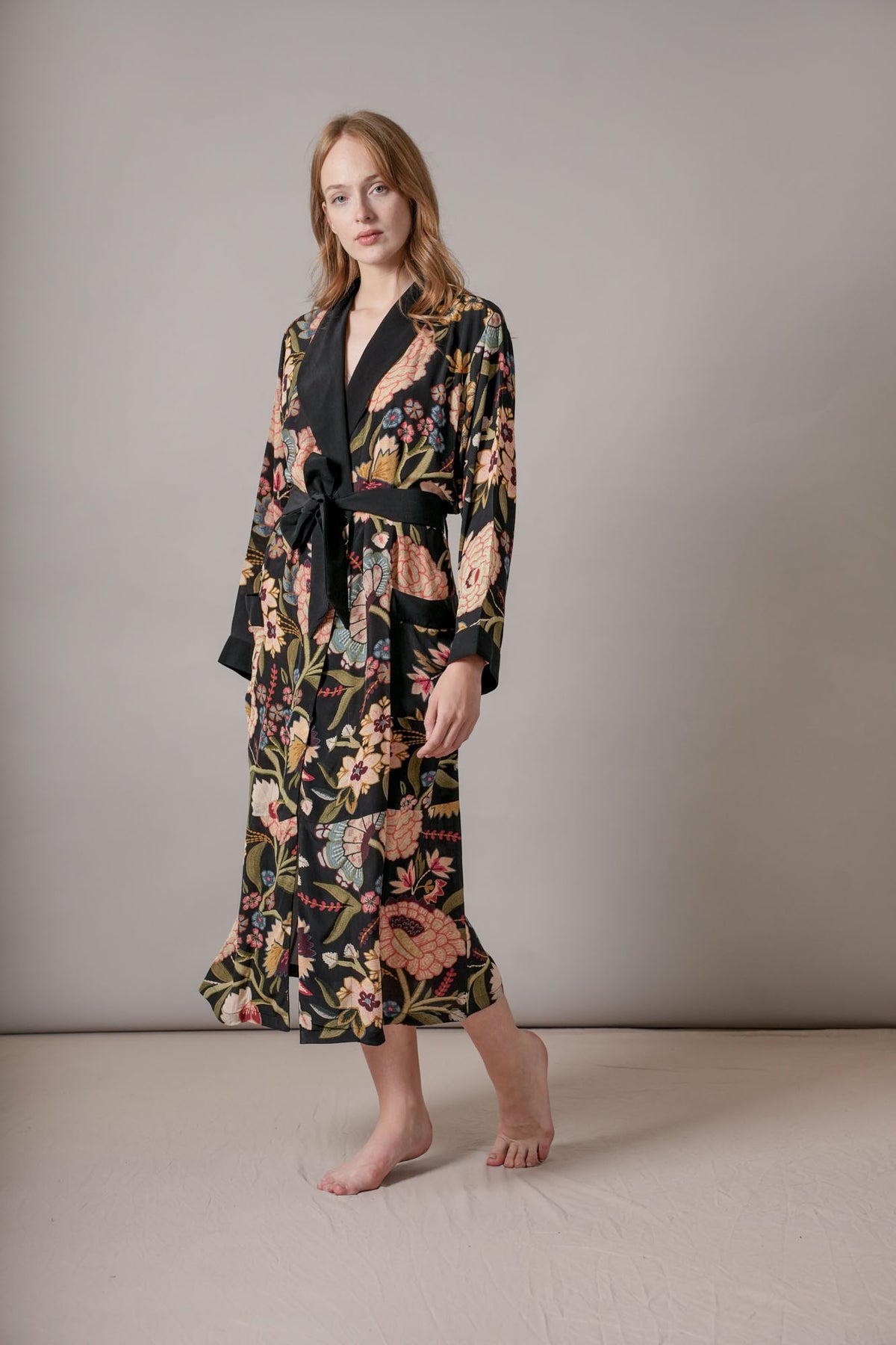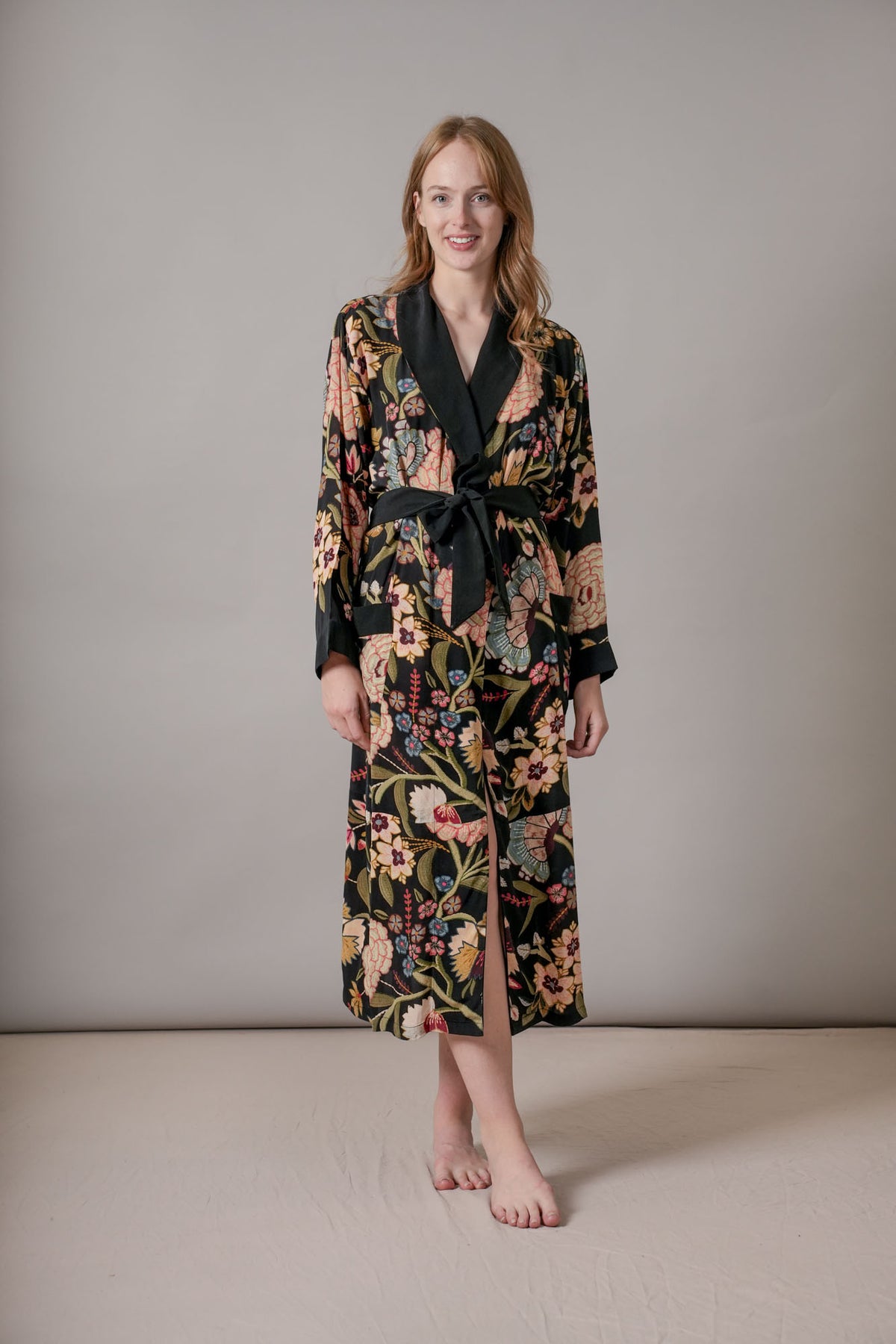 Looking for a gown with a little more weight? We have used our own crepe fabric for this gown which gives a wonderful 1920s feel to the garment, while providing a little extra weight and less transparency. This design falls to an elegant long length and features a fold over collar, complete with self-tie waist belt and front patch pockets. This gown is perfect as a luxurious house coat or for layering as a chic accessory to your favourite outfit.