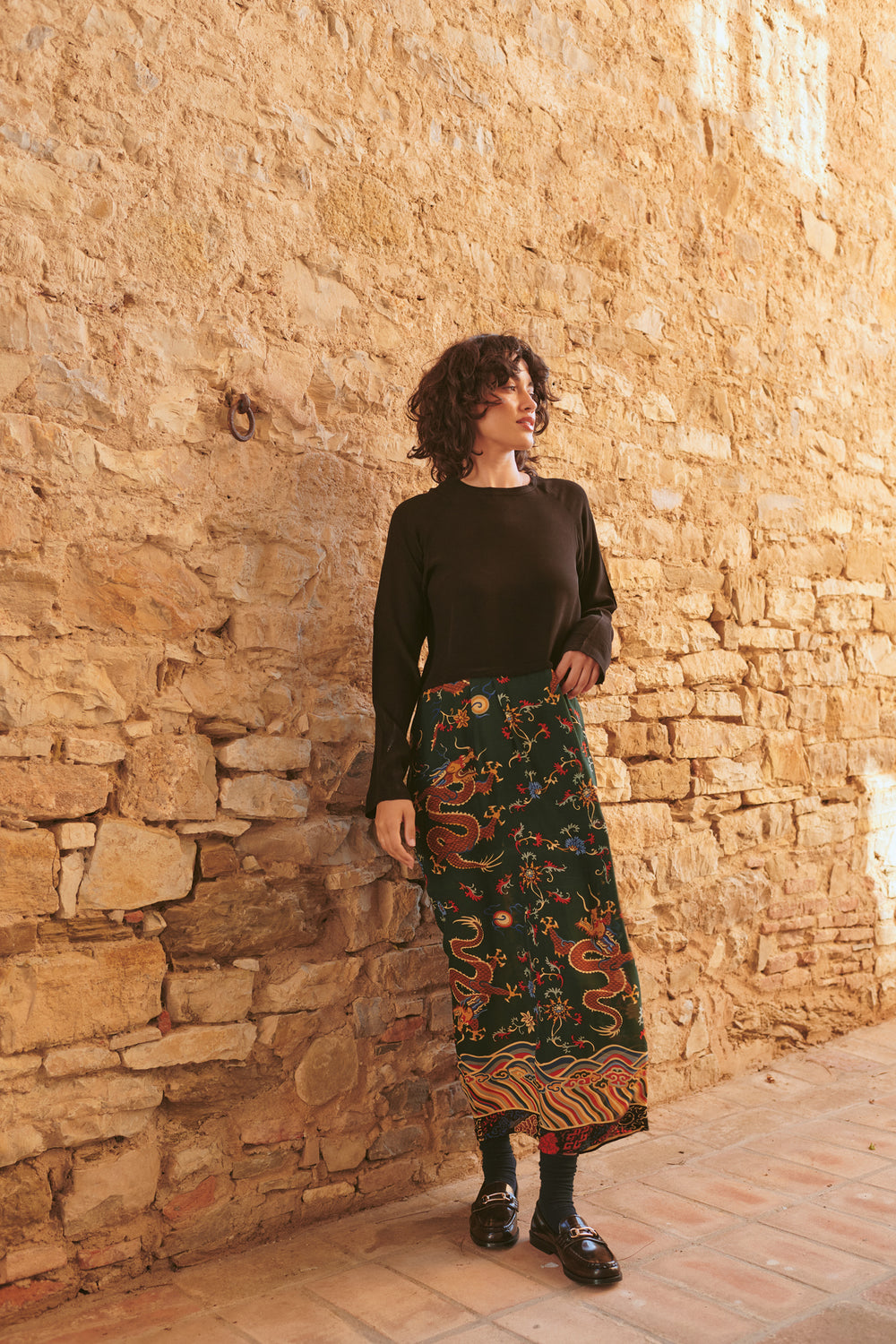 The Chinese dragon, or Lóng, has inspired this print. We have used deep, rich complementary colours to give a fresh look to the vintage pattern. Heavy background colours with gold dragons moving over the print and finished with a geometric border. In Chinese culture, dragons are seen as a symbol of good luck, prosperity, and power. We hope wearing our beautiful dragon pieces gives you all three!
