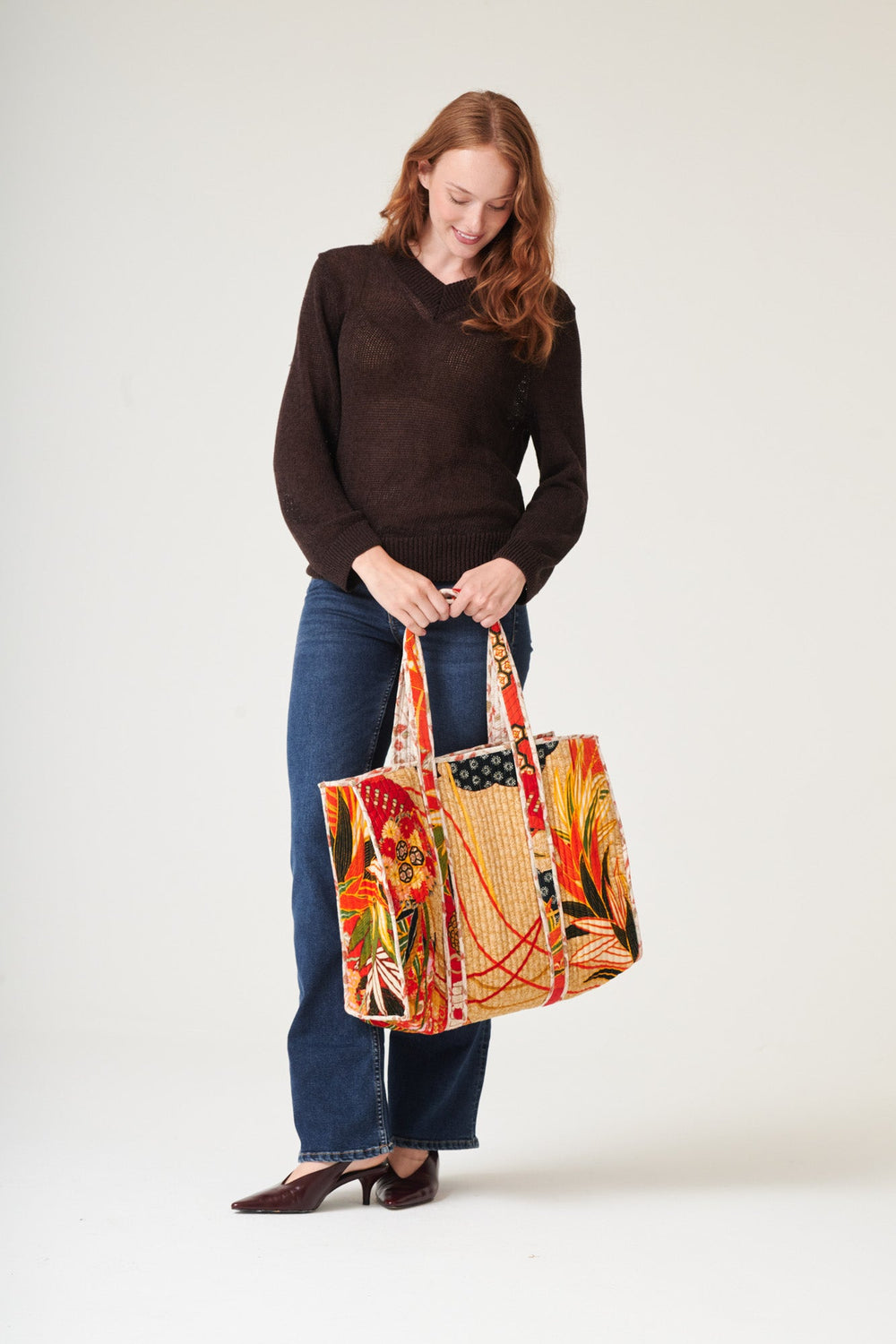 This 100% organic cotton velvet tote bag is perfect as a handbag, taking on a trip away, and even elevating your look as a statement accessory. With a large main compartment and a small handy inside pocket, this velvet tote has enough room to store all the products you’d need for any event.