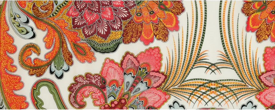 A modern look at a traditional Indian paisley, our Fiesta print has a fantastic and stunning colour range inspired by Spain. Showcasing bright oranges and hints of calming greens with bohemian elements, this design is perfect for adding a new signature style to your wardrobe.