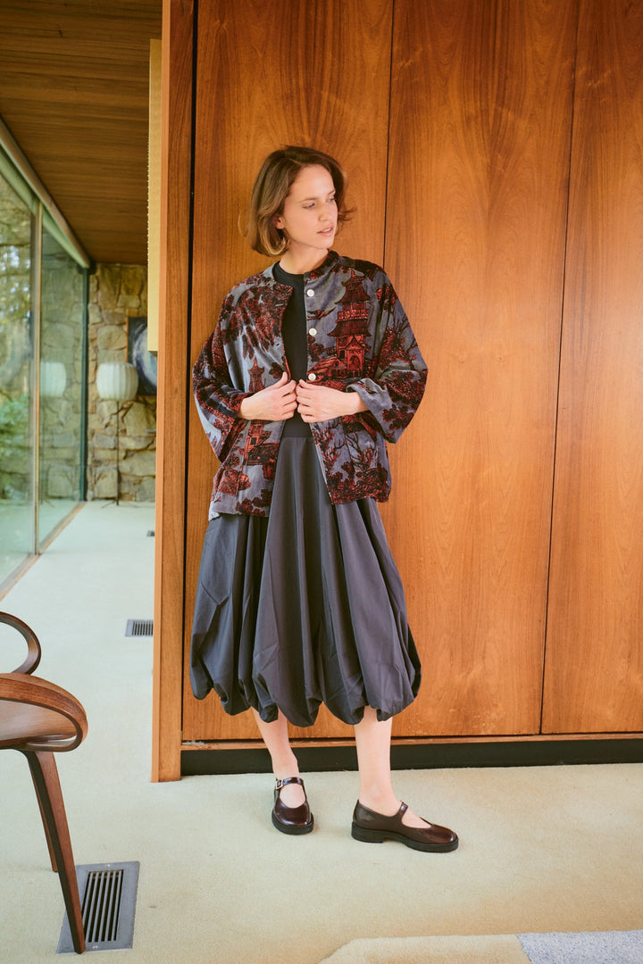 A beautiful soft, short velvet jacket. With a mandarin collar, patch pockets, mother of pearl buttons, and loose-fitting ¾-length sleeves, this jacket will be a staple piece to take you through the cooler months.