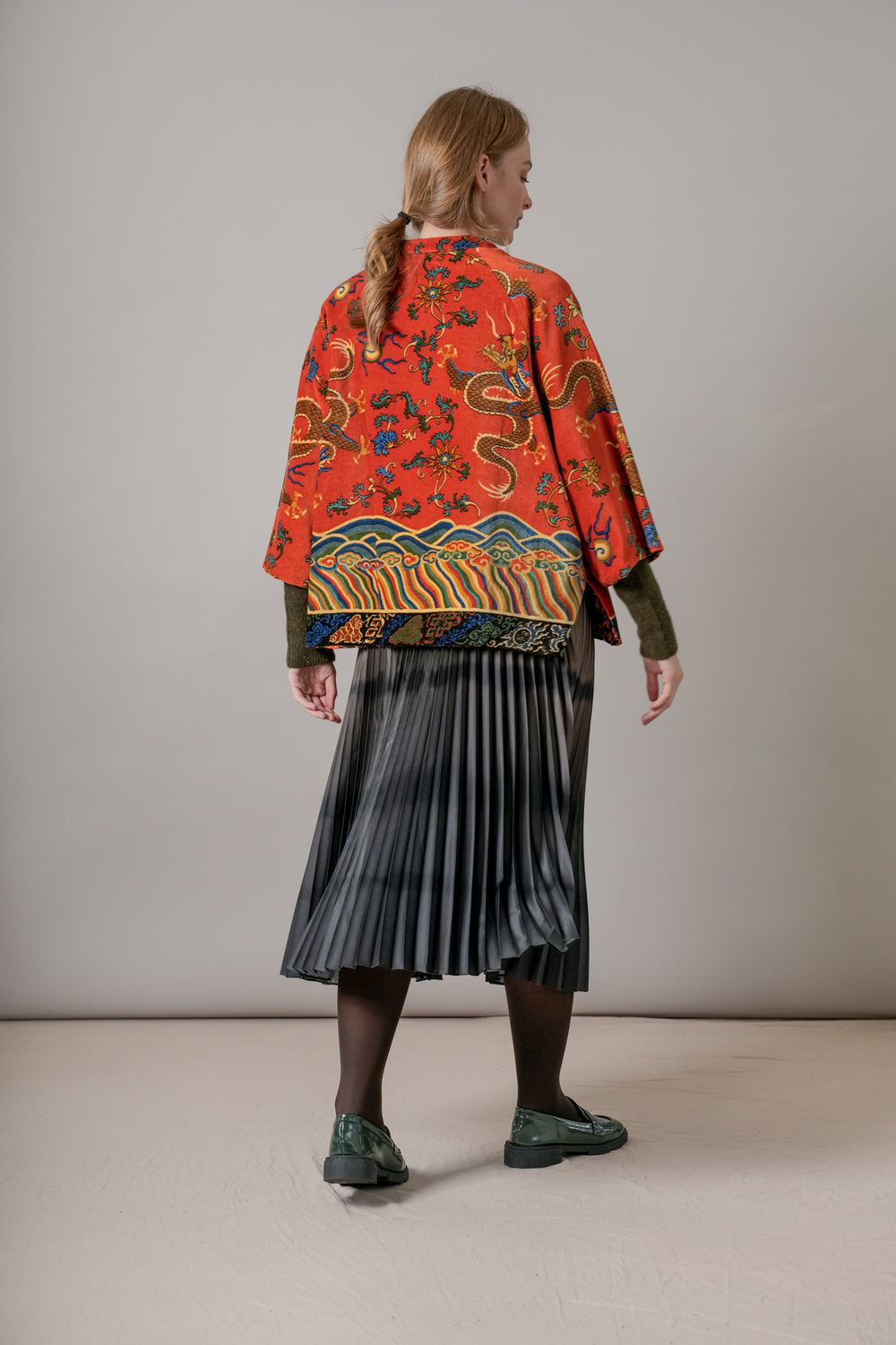 The Chinese dragon, or Lóng, has inspired this print. We have used deep, rich complementary colours to give a fresh look to the vintage pattern. Heavy background colours with gold dragons moving over the print and finished with a geometric border. In Chinese culture, dragons are seen as a symbol of good luck, prosperity, and power. We hope wearing our beautiful dragon pieces gives you all three!