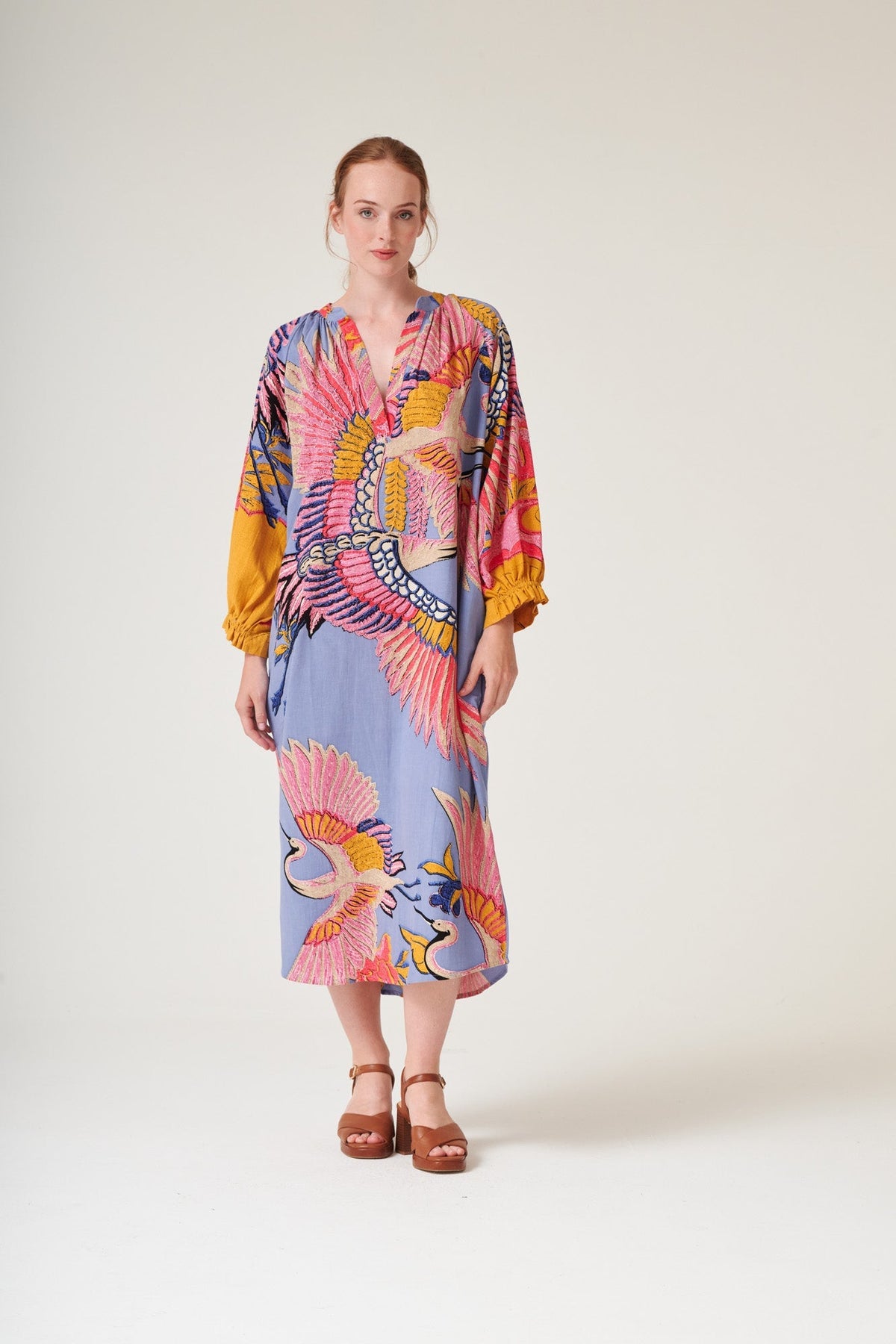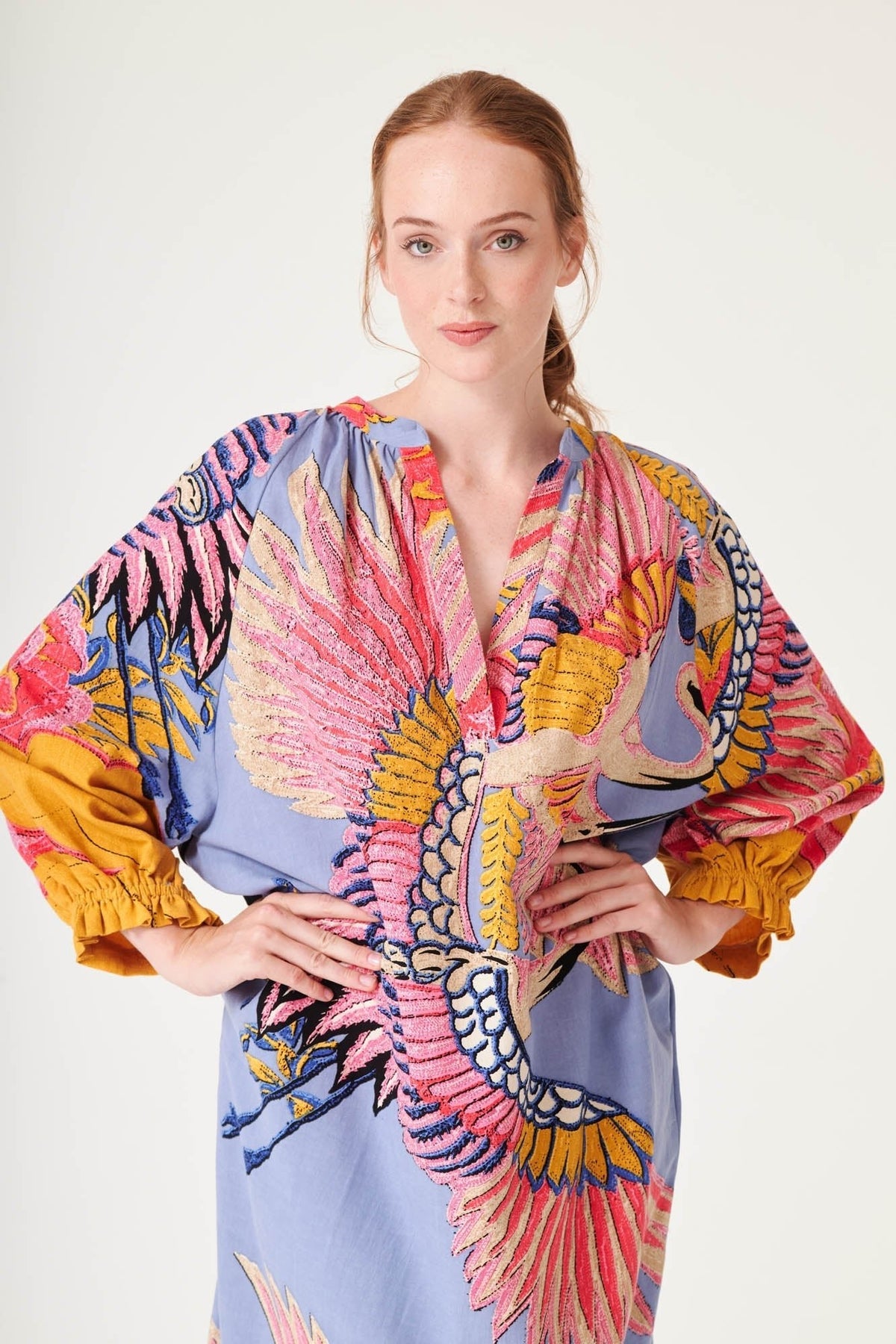 Made with a linen mix fabric, this dress features a flattering placket neckline, a raglan sleeve, hidden side pockets and a half elasticated cuff and perfectly displays our bespoke prints.
