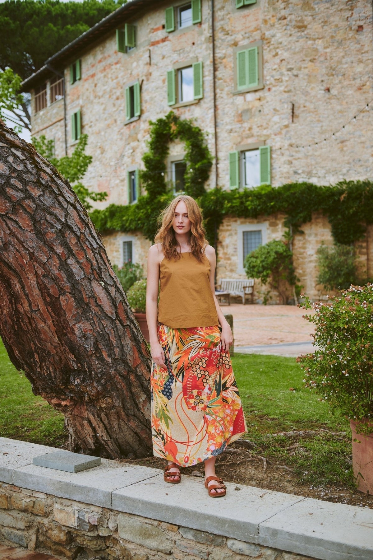 Our A-line Maxi Skirt features the must-have pockets and is fully lined using organic cotton. It has partly elasticated waistband at the back of the skirt and a flattering wide band at the front.