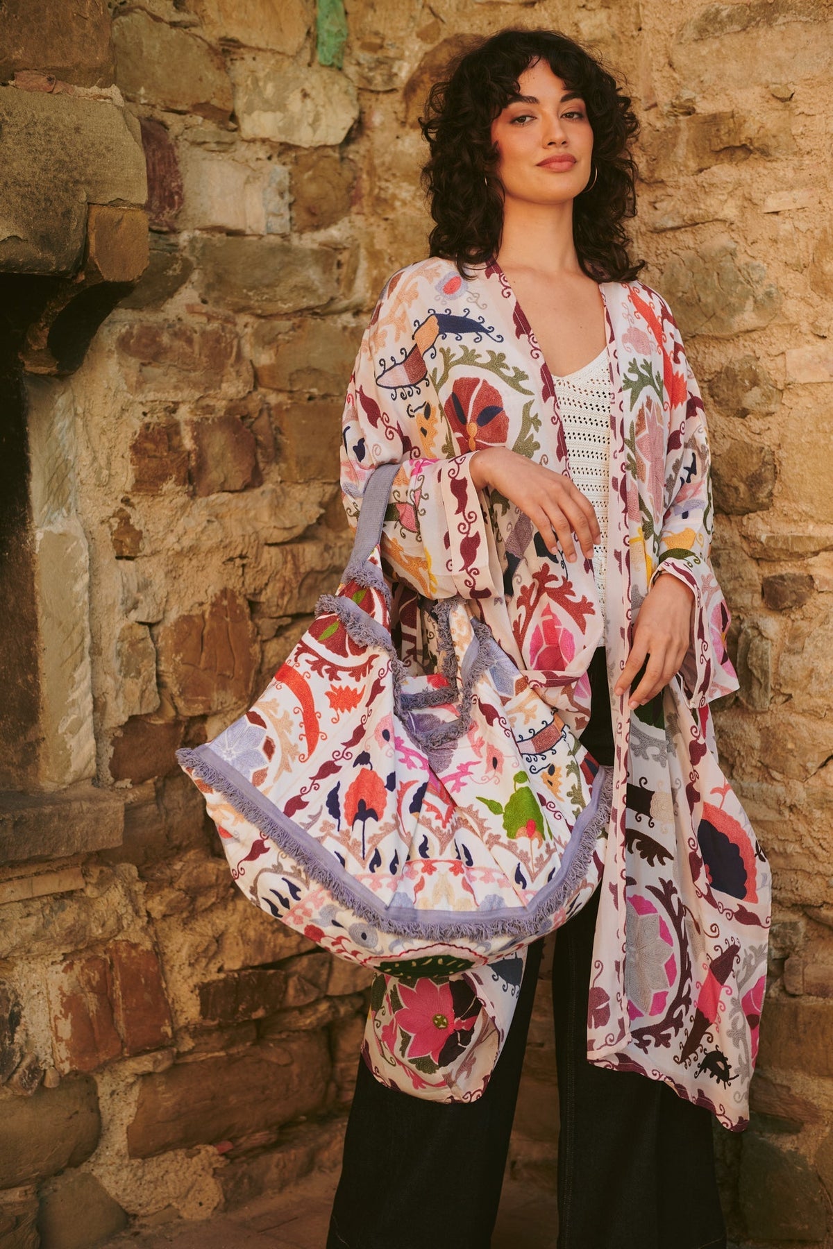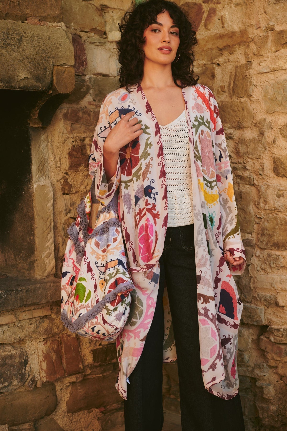 A bold oversized pattern inspired by traditional Suzani needlework throws originating from East Asia made by embroidering a chain stitch pattern to a cloth base.