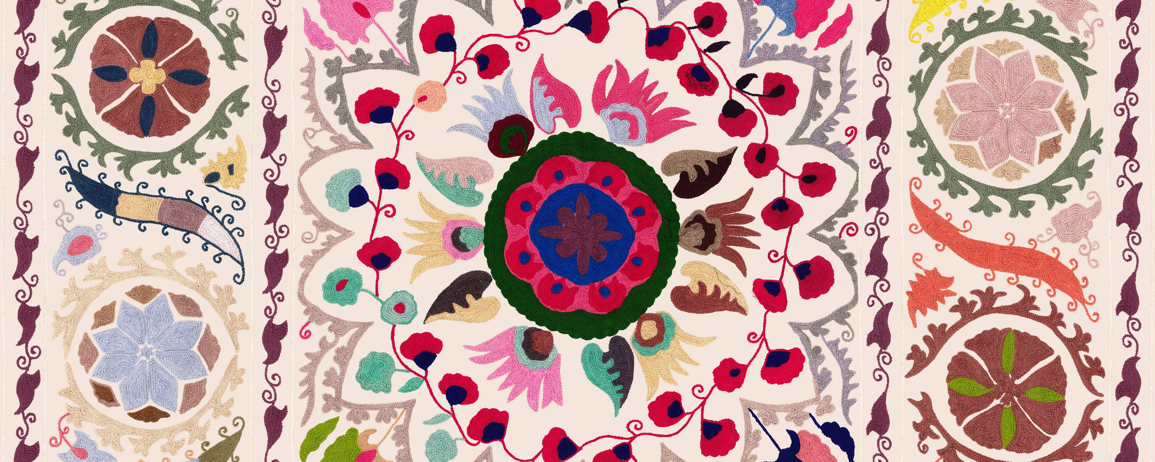 A bold oversized pattern inspired by traditional Suzani needlework throws originating from East Asia made by embroidering a chain stitch pattern to a cloth base.
