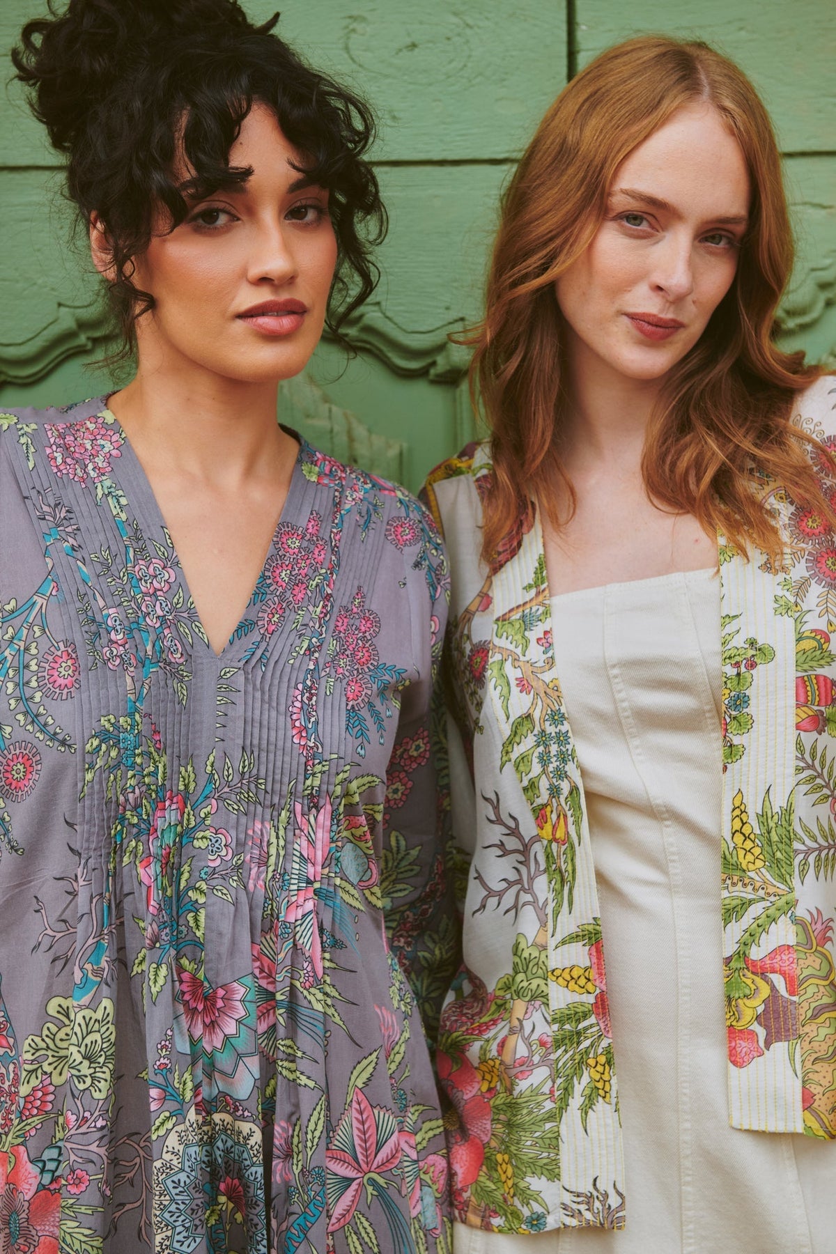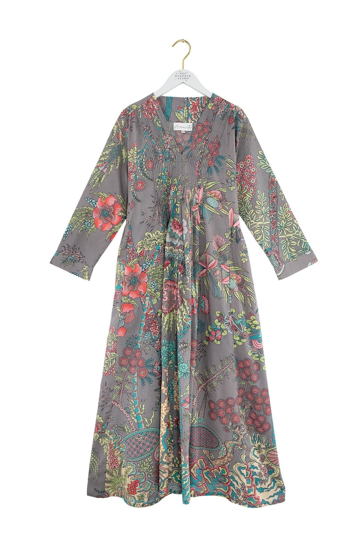With its delicately pleated placket top leading down to a flowing maxi skirt, this dress showcases the entire One Hundred Stars signature print.