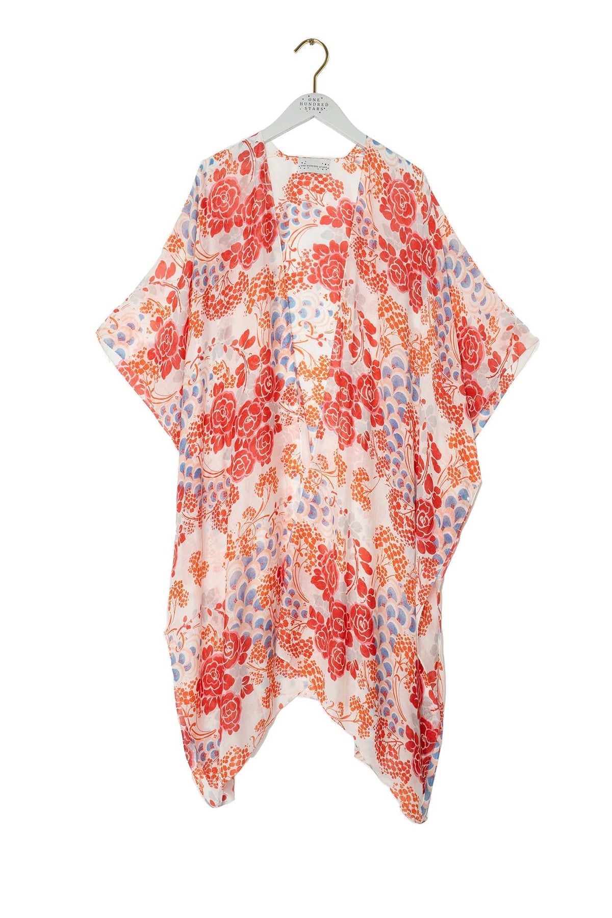 An explosion of colour featuring a delicate floral pattern, our Confetti Scarlet print is inspired by Japanese paper designs that are often used as a decorative feature. Hot reds, oranges, and a splash of cool blue flow throughout the print to make a perfect new addition to your summer wardrobe.