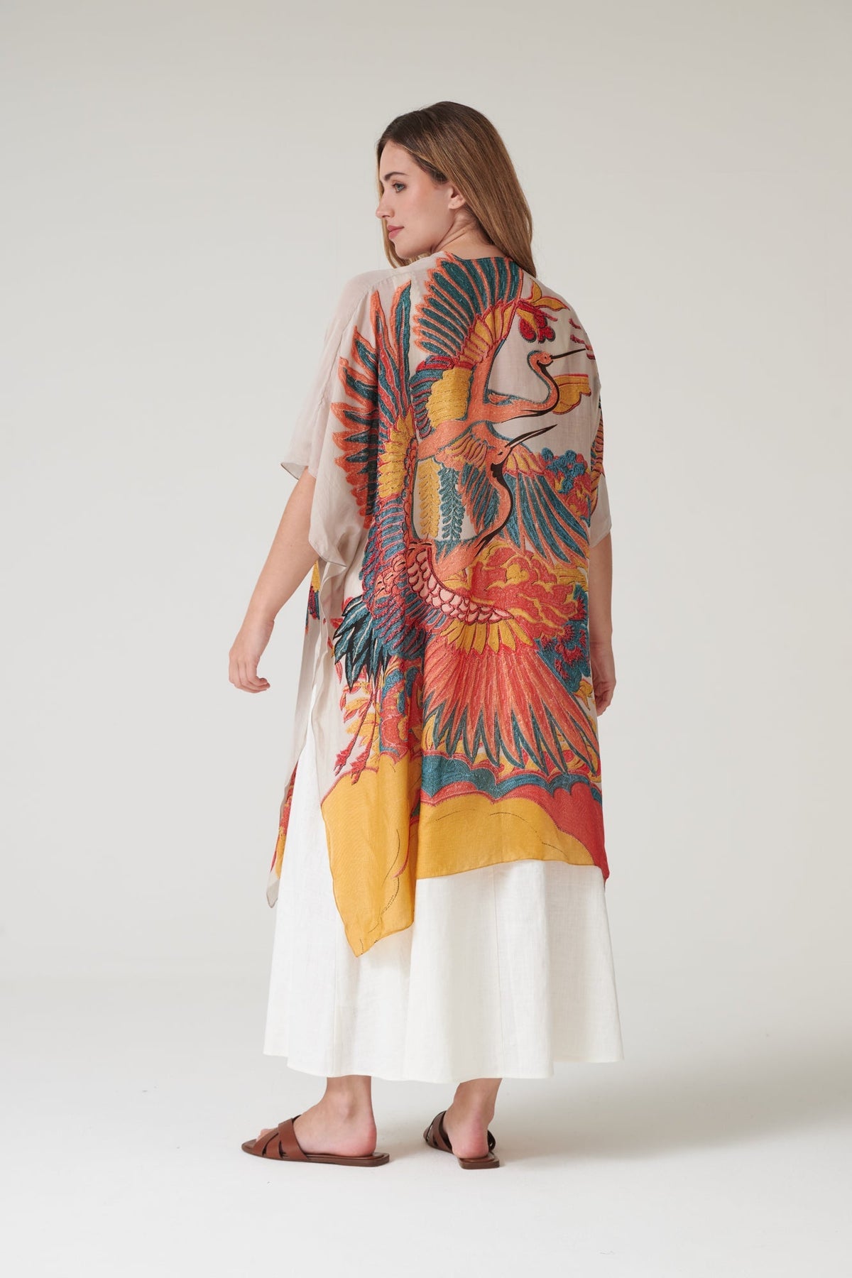 The Crane, a symbol of happiness. This bold pattern with an exciting mix of colour is delightful. This clever colour palette of green, blue, and orange on the crane set off against the stone background will make the wearer smile.