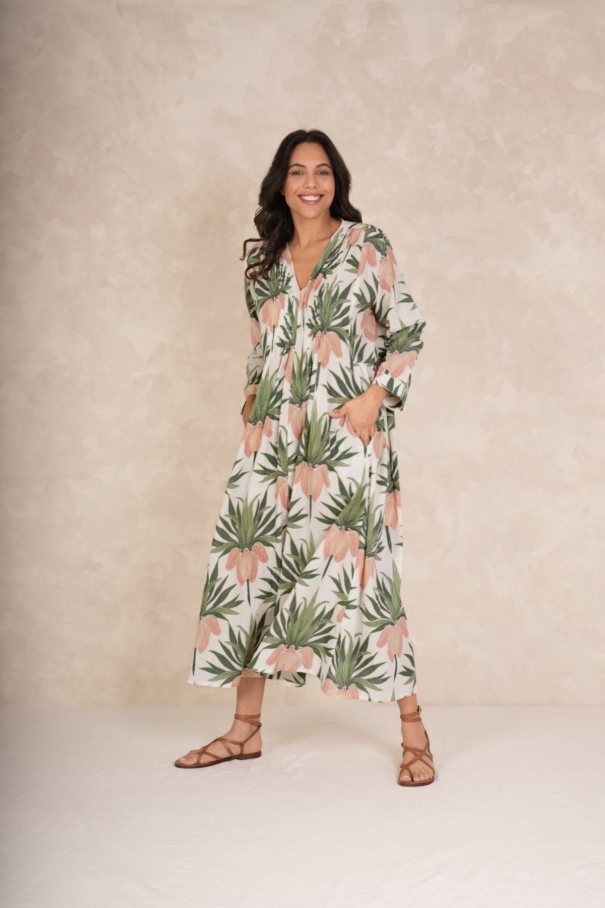 With its delicately pleated placket top leading down to a flowing maxi skirt, this dress showcases the entire One Hundred Stars signature print.