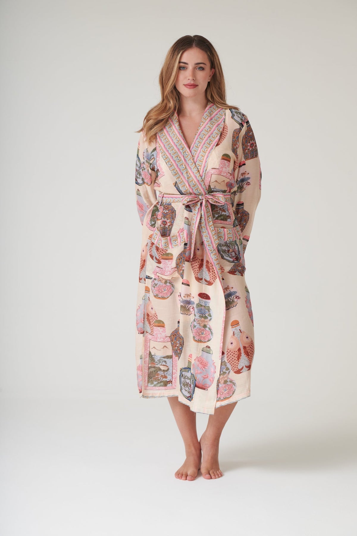 The lightweight design falls to an elegant long length and features a fold-over collar, complete with a self-tie waist belt and front patch pockets.