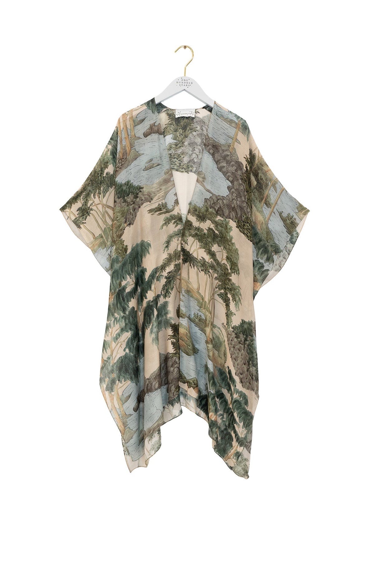 A hand drawn illustration of different types of trees set around natural pools and rivers. Green and grey watercolours give this print a dreamy, faded quality of a classic print.