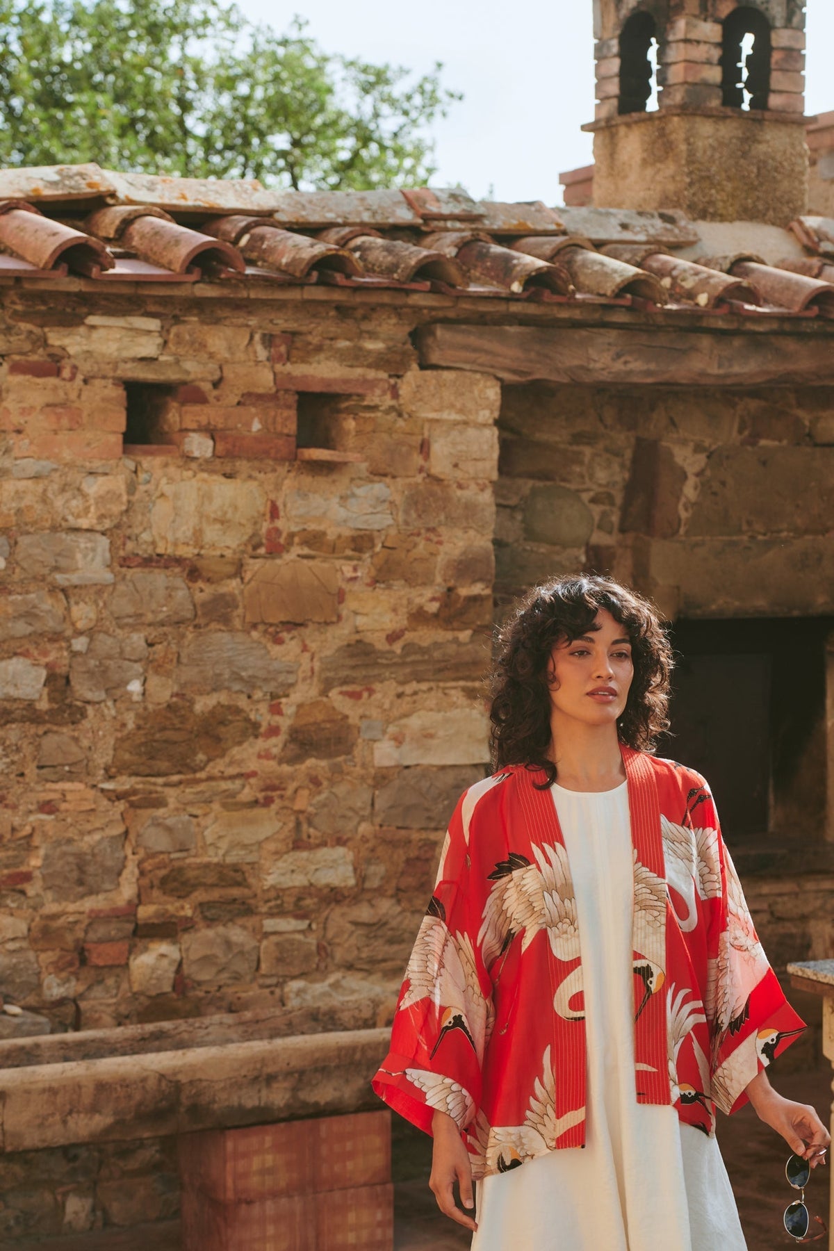 Our bestselling kimono jackets have loose ¾ length sleeves, an open front and a lightly embroidered lapel. Pair with a matching camisole and your favourite jeans in summer or layer over a polo neck during the cooler months.
