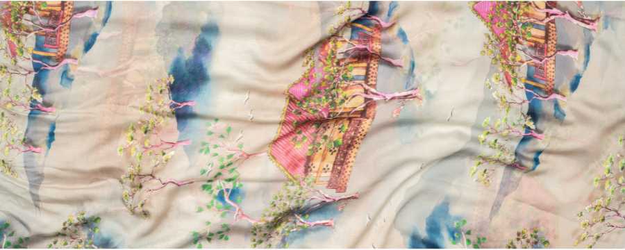 A watercolour of moody greys with a Japanese landscape highlighted with a touch of neon pink. Moody and ethereal, a classical print that works at any time of year.